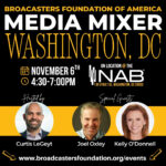 New York, NY – October 7, 2025 – The next Media Mixer from the Broadcasters Foundation of America (BFOA) will be hosted by Curtis LeGeyt (center), President and CEO of the National Association of Broadcasters (NAB), with special guests NBC’s Kelly O’Donnell (left), one of the most highly respected journalists in broadcasting, and Joel Oxley…